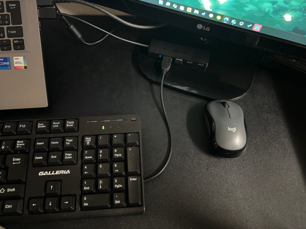 会社用と私用のPCを使うたびにしまったり出したり繰り返してたんだけど、毎回キーボードとマウスを挿しなおすのがかなりめんどくさかった。今回USBハブを導入したことで、USBハブにマウスとキーボードを接続してしまえば、PCを入れ替えてもUSBハブのケーブルをPCに1か所挿すだけで済むことに気づいた。ハブで1セットで考えて、今後はPC周りを整理していこうと思う。